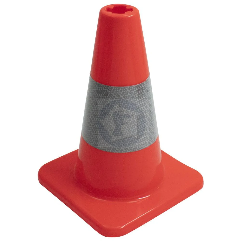 Výstražný dopravný kužeľ červený s dvoma bielymi reflexnými pruhy.