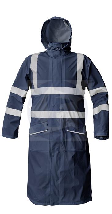 • nepremokavý a vetruodolný predĺžený plášť s kapucňou v golieri • dĺžka 120 cm • obvod kapucne možno upraviť sťahovaním na šnúrku • dve široké predné vrecká kryté légami chrániacimi voči prieniku vody • spodný lem rukávov možno polohovať