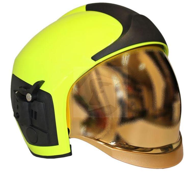 Prilba HPS 7000 PRO H1 so zlatým integrovaným zorníkom pre ochranu tváre, s fixáciou do protichemických oblekov s ochrannými okuliarmi, vybavená čelným štítkom s adaptérmi pre masky s rýchloupínačmi a voliteľnými doplnky pre montáž externé svietidlá alebo integrovanou prilbové svietidlo HPS 7000.
