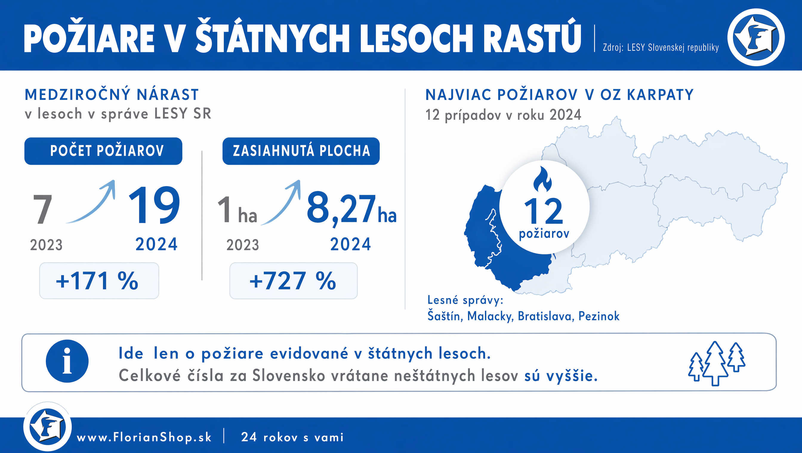 Podľa údajov LESY Slovenskej republiky vzrástol v lesoch v ich správe medziročne počet požiarov zo siedmich na devätnásť a zasiahnutá plocha stúpla z jedného hektára na 8,27 (Lesy). Najviac požiarov bolo zaznamenaných na území OZ Karpaty – dvanásť prípadov v oblasti Lesných správ Šaštín, Malacky, Bratislava a Pezinok (WebJET CMS). A to sú len požiare evidované v štátnych lesoch. Celkové čísla za Slovensko vrátane neštátnych lesov sú vyššie.