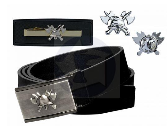 Balíček obsahuje kožený opasok HASIČI 35 mm a zlatú kravatovú sponu Hasiči.